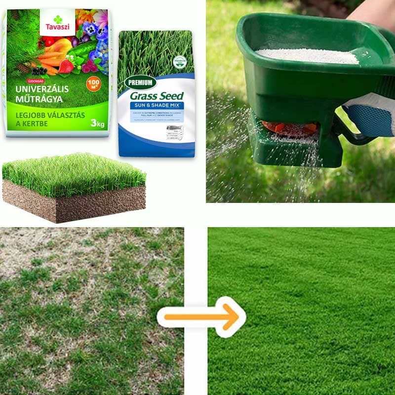 • Készlet 50m2-re: Műtrágya 1,5kg + Vetőmag "Premium Grass" 0,5kg + kézi vetőgép