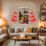 A fűtőpanel nagyon lapos – akárcsak a képen -, így közvetlenül a falra akasztható, ahonnan kellemes meleget sugároz.