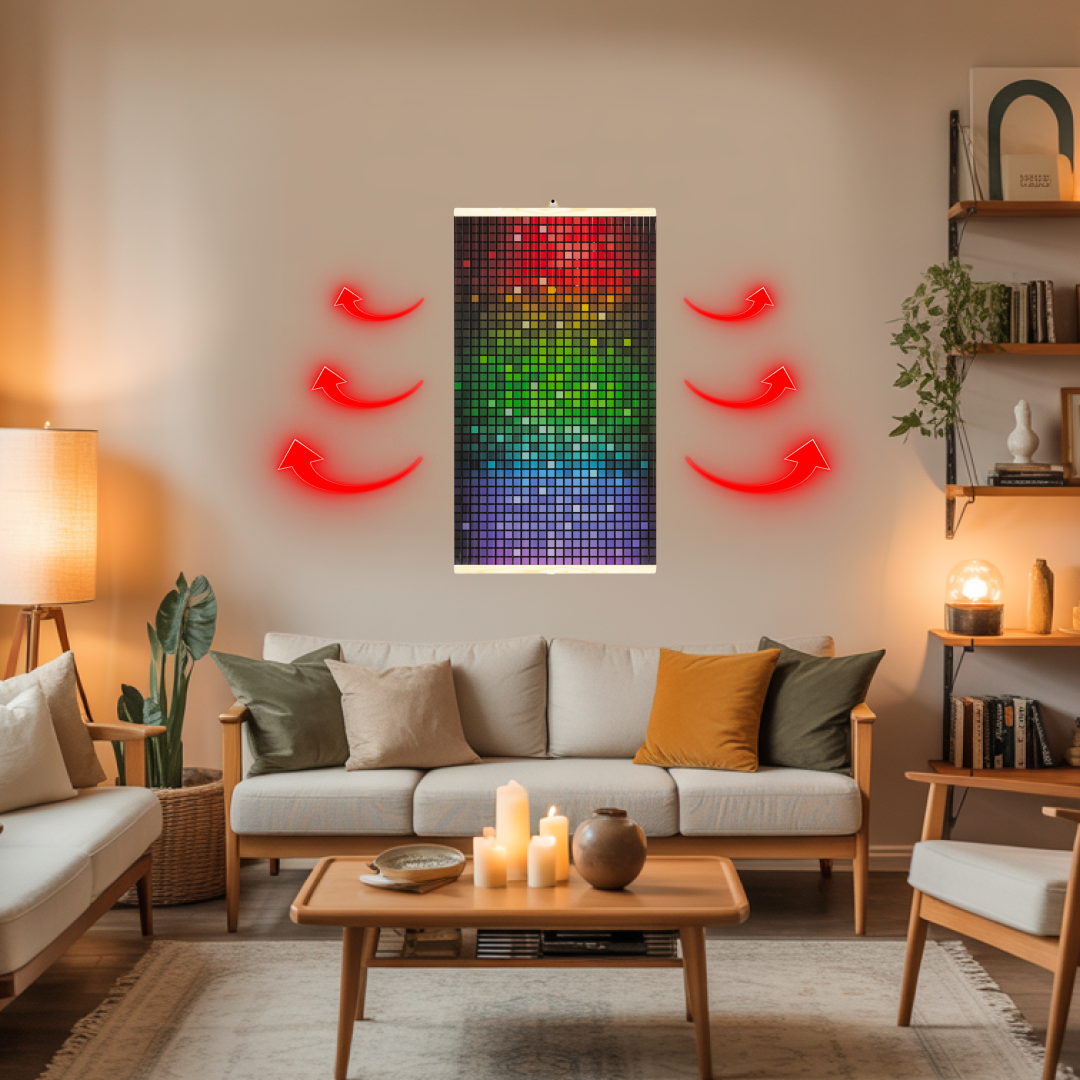 A fűtőpanel nagyon lapos – akárcsak a képen -, így közvetlenül a falra akasztható, ahonnan kellemes meleget sugároz.