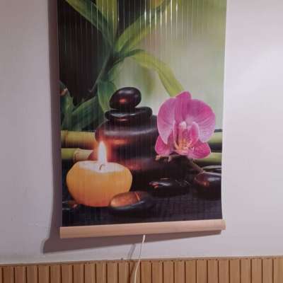 A fűtőpanel nagyon lapos – akárcsak a képen -, így közvetlenül a falra akasztható, ahonnan kellemes meleget sugároz.