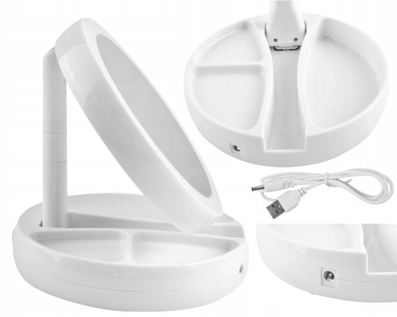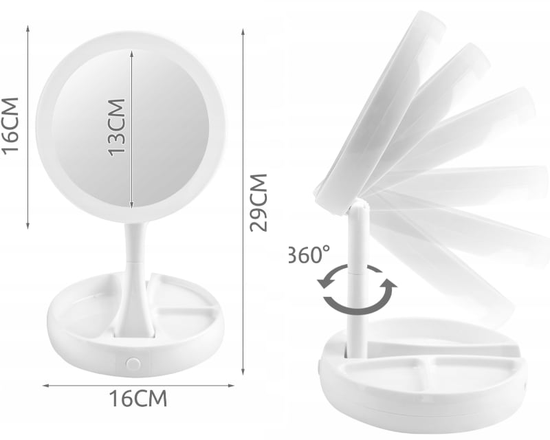 - BEÁLLÍTÁS – a termék dőlésszögét és a forgásszöget Ön állíthatja be. 360 fokban forgatható; Ez lehetővé teszi a teljes illeszkedést. A tökéletes smink elkészítéséhez nem kell felemelnie a tükröt – csak állítsa be a dőlésszöget, és tökéletesen meg fogja világítani az arc minden részét.