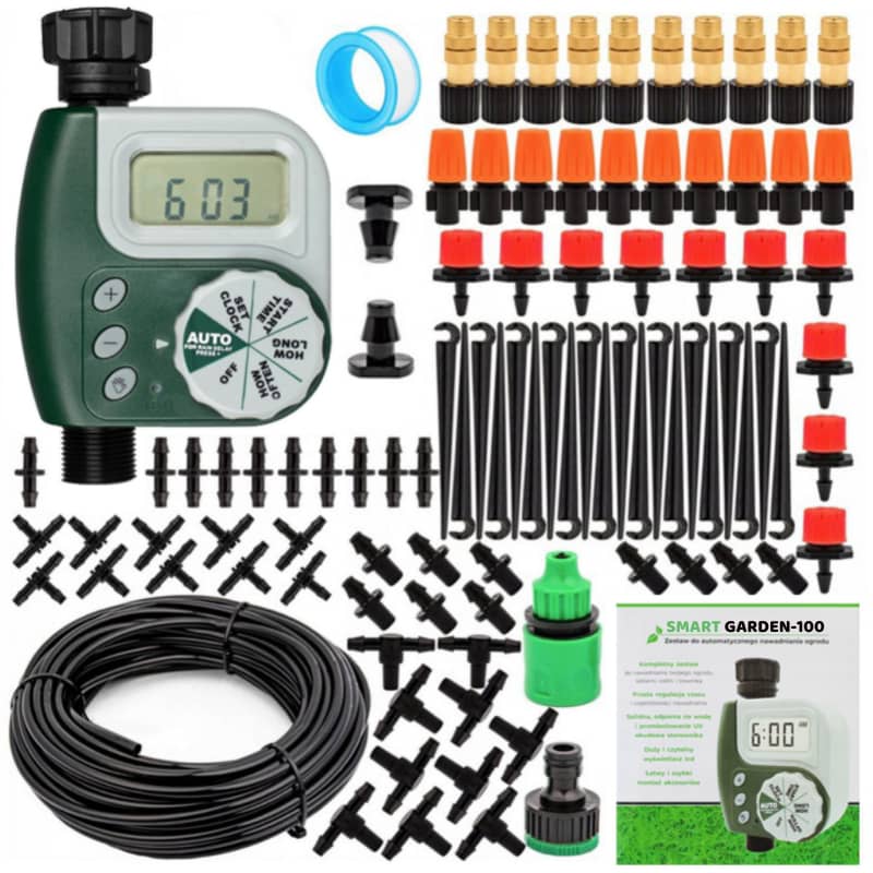 A „Smart Garden” egy kész készlet a kert, a gyümölcsös és a pázsit automatikus öntözésére. A készlet 96 elemet tartalmaz, beleértve. vezérlő, tömlő, állítható fúvókák, csatlakozók és tartozékok. Ez a rendszer nem csak a kertben és a telephelyen, hanem az erkélyen vagy teraszon is alkalmazható. Ideális üvegházakban való használatra.