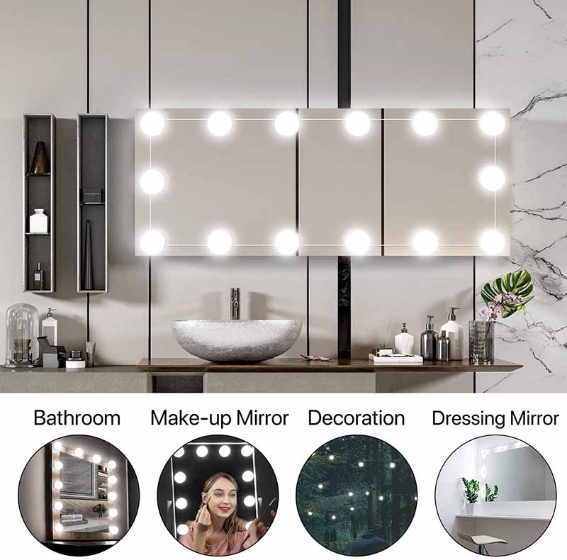 A lámpák összeszerelése gyors és egyszerű, szó szerint 1 percet vesz igénybe! Csak húzza le a kétoldalas ragasztó védőszalagot, és nyomja a rögzítési felülethez. A nyúlékony kábelnek köszönhetően a világítás bármilyen típusú tükörhöz vagy sminkasztalhoz illeszthető.